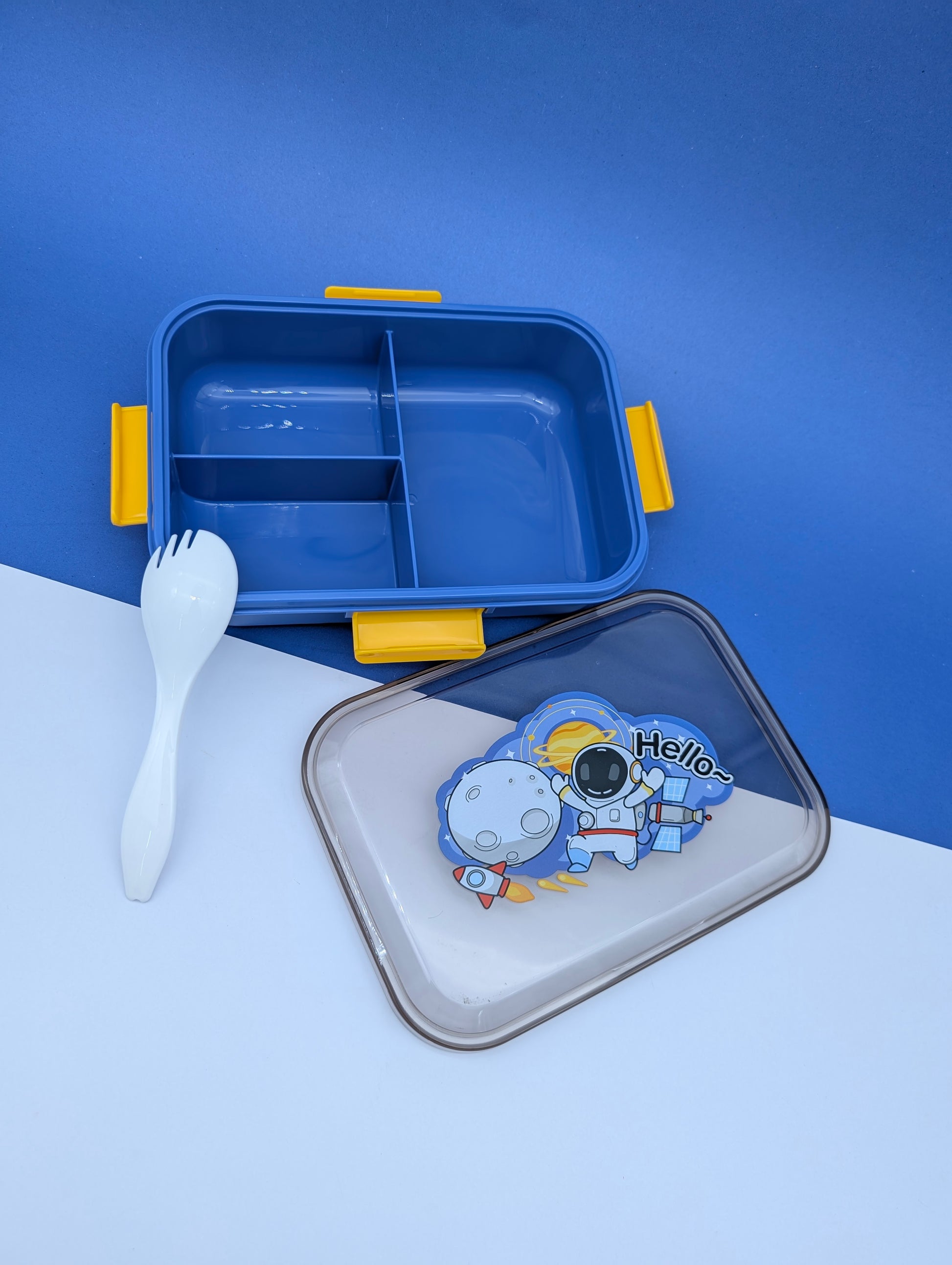 - The third lunchbox has a dark gray base and a lid with an astronaut and the word "Hello!".