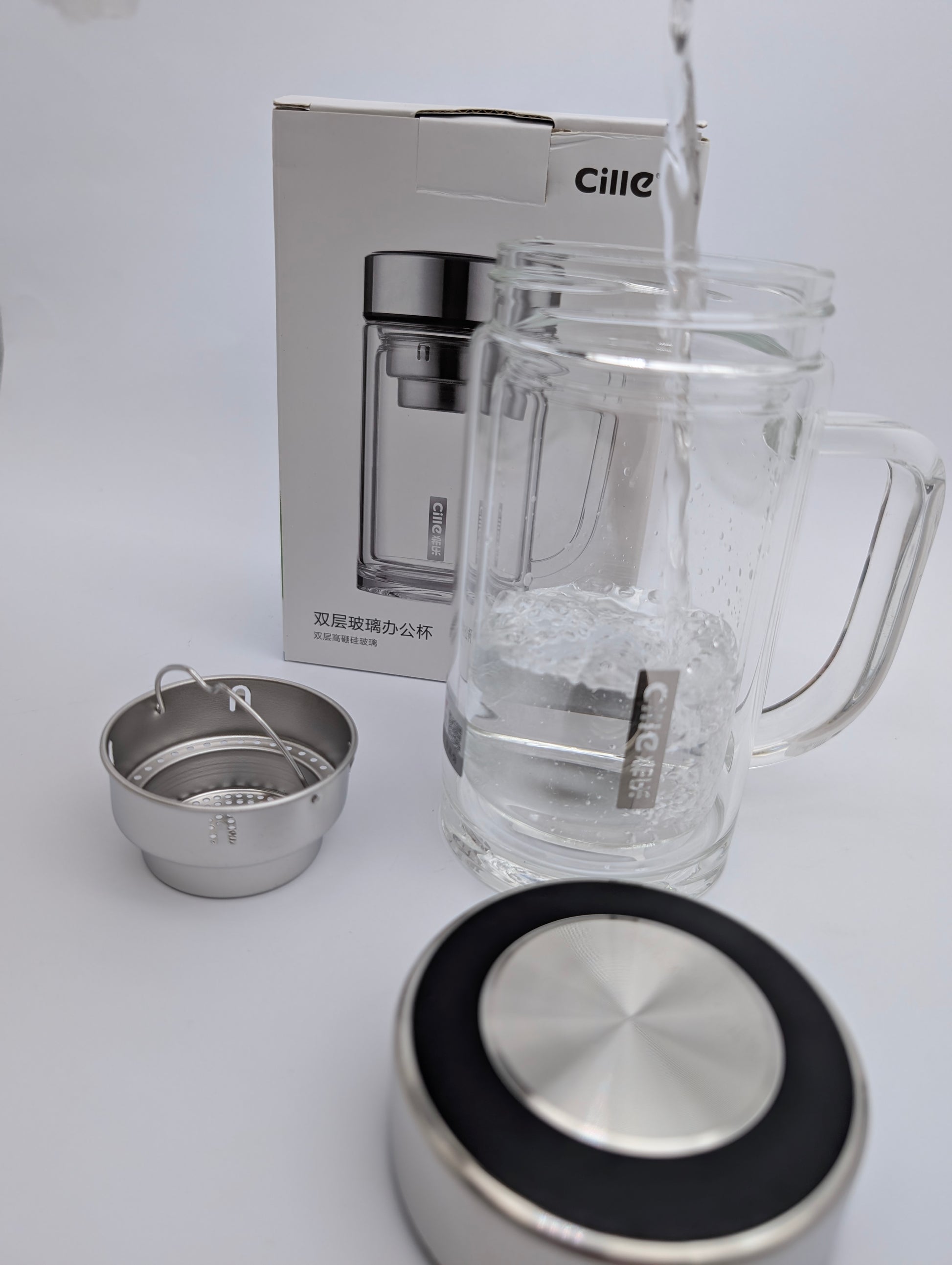 This is a 350ml tea mug by the brand "Cille," featuring a double-layered glass design and a built-in stainless steel infuser.