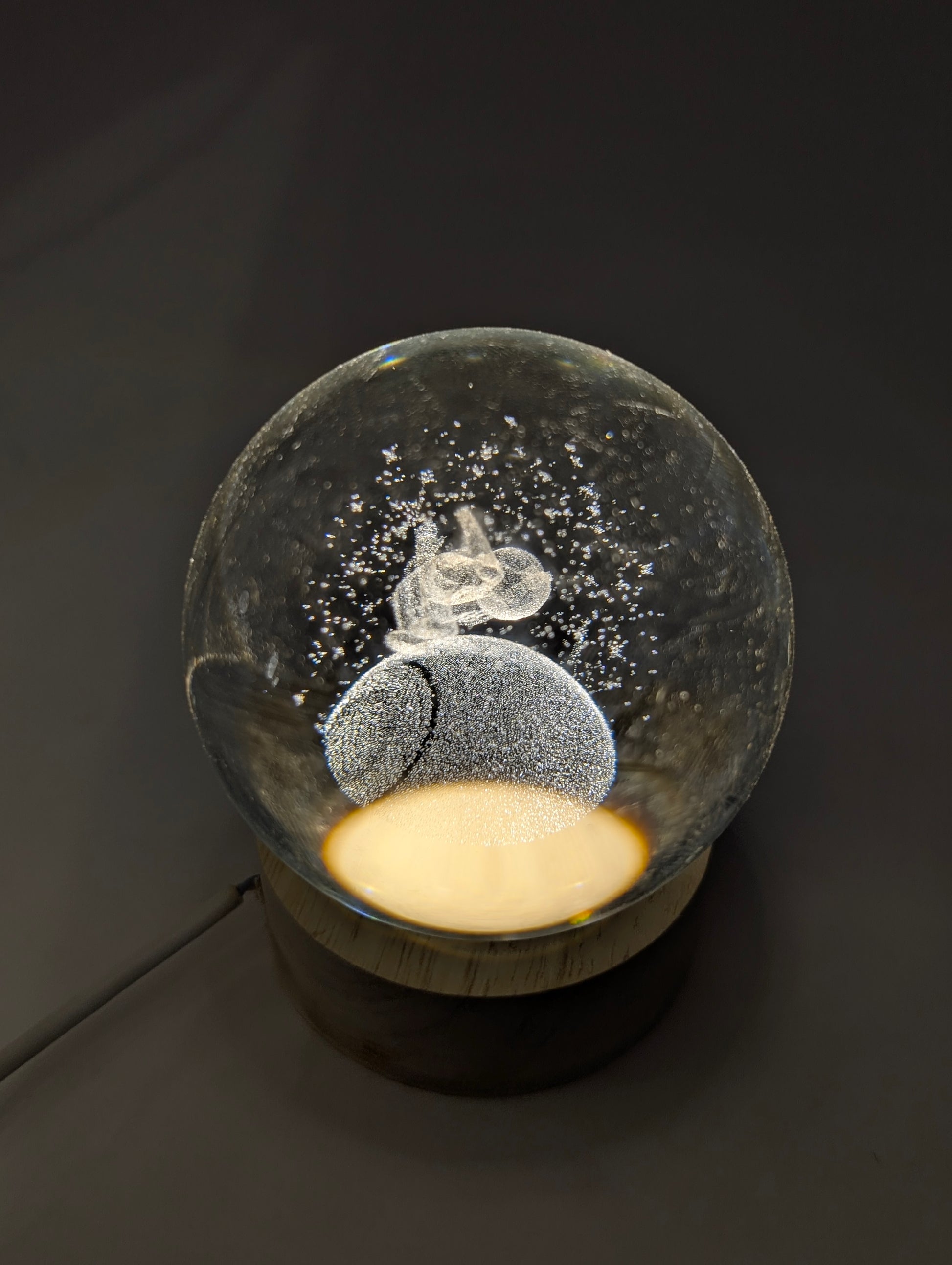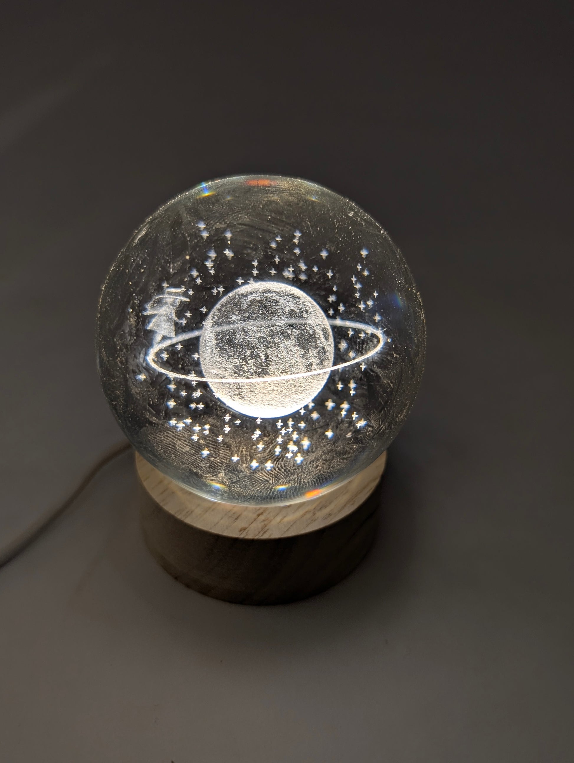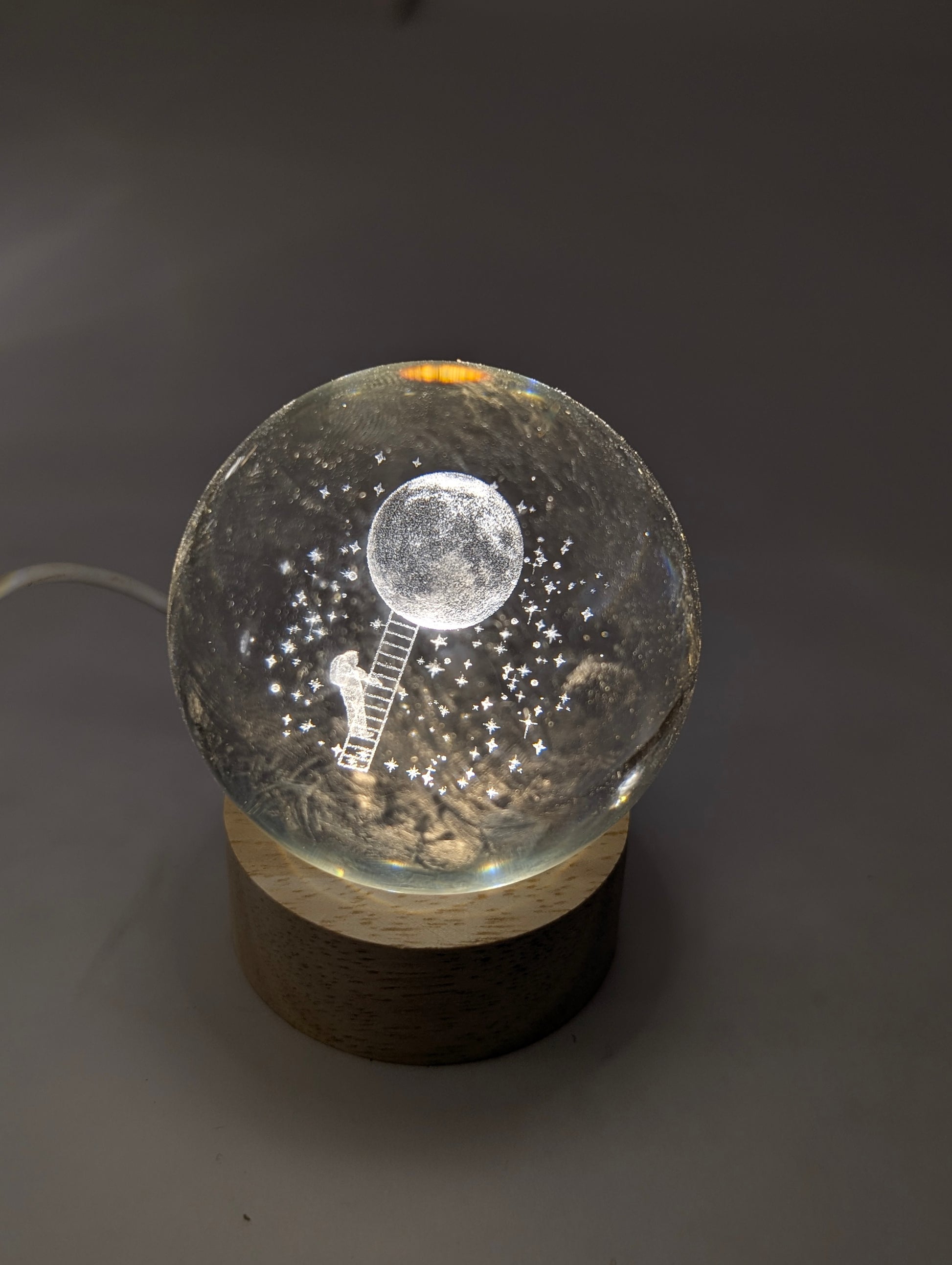Wooden Base with Light: The orbs sit on a wooden base that contains an internal light, which illuminates the engraved design from below. πͺ΅