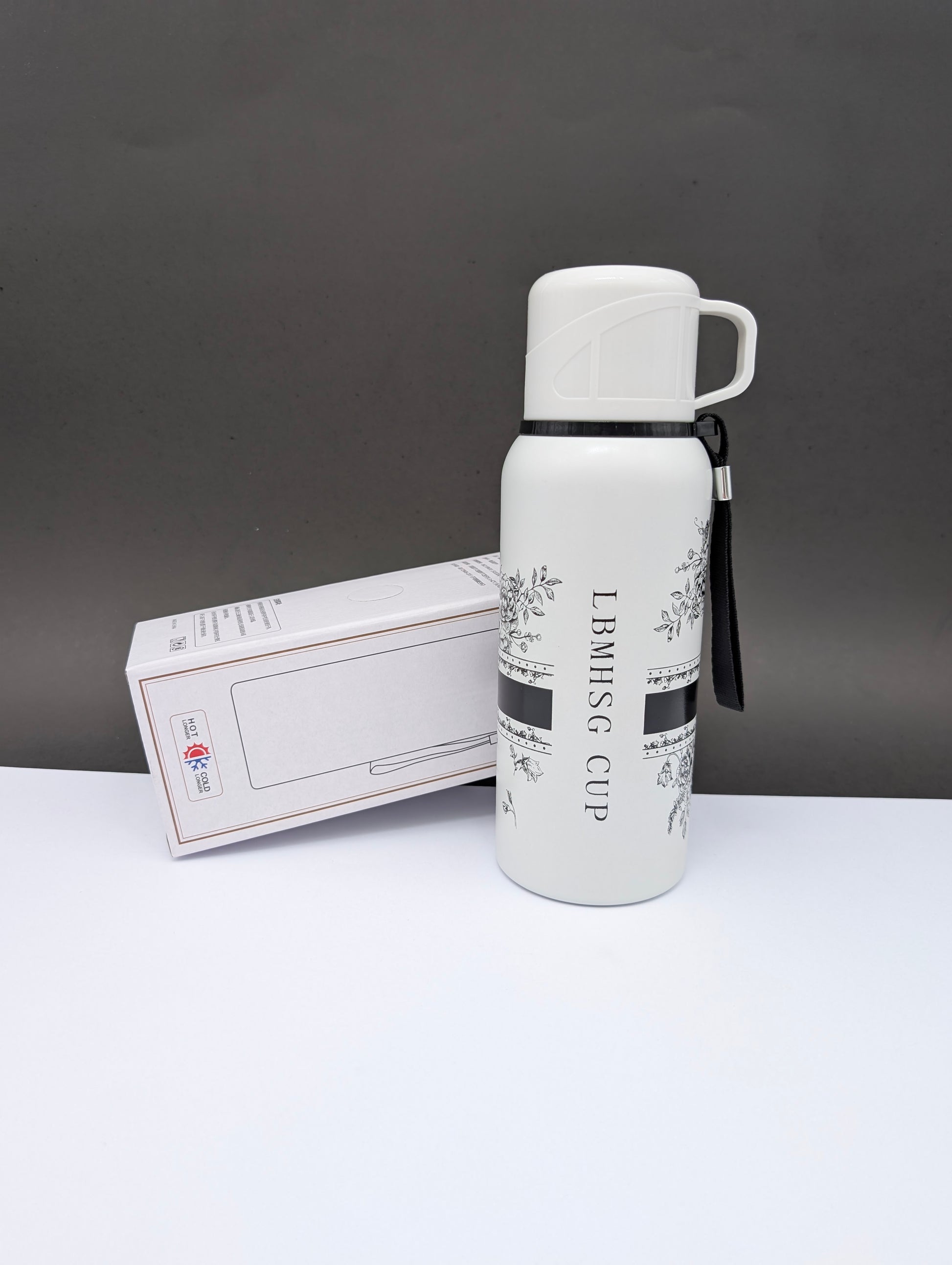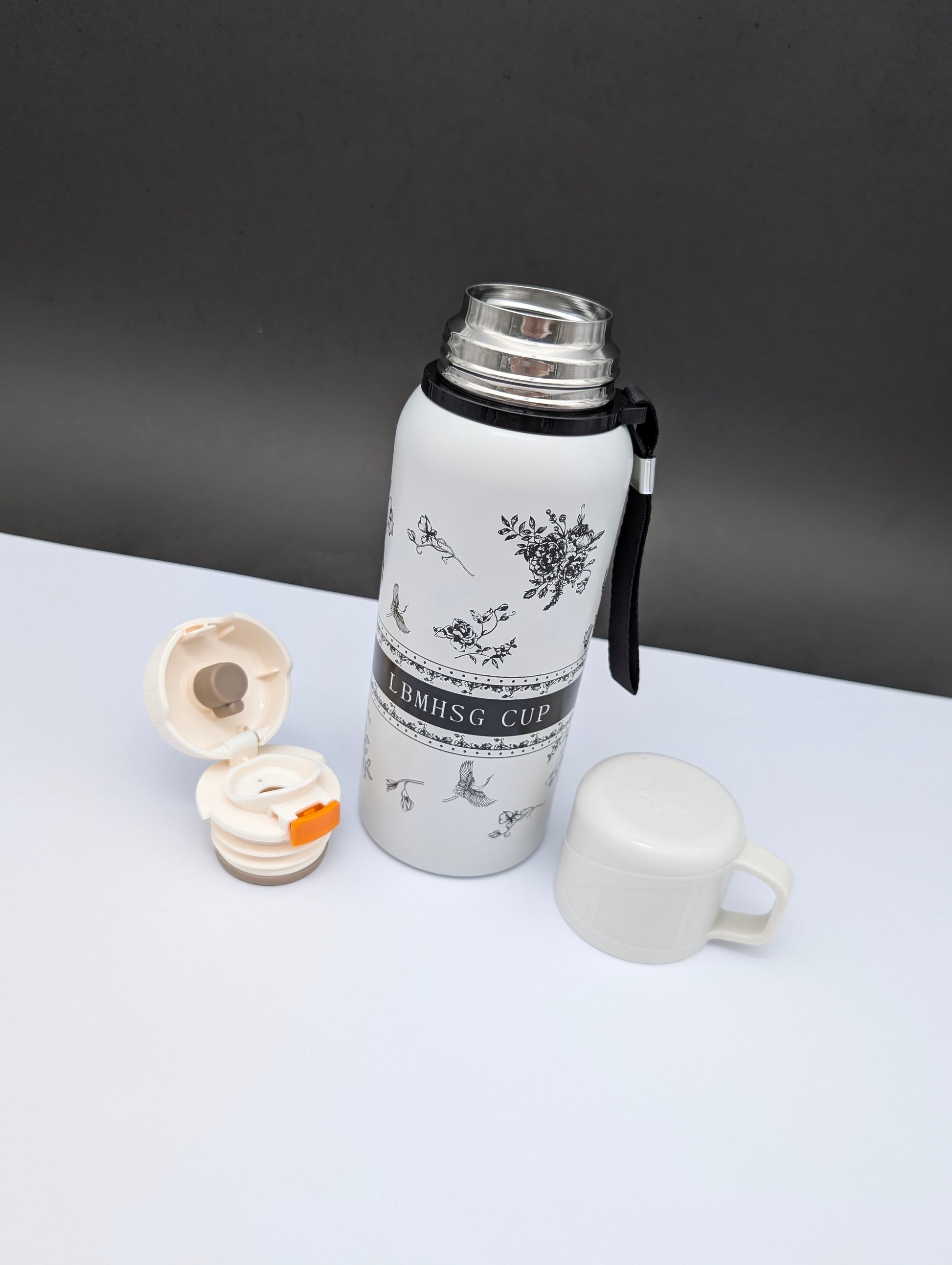 This is a white thermos cup with floral designs and the text "LBMHSG CUP". It comes with an additional lid and a small mug, all packaged in a box.