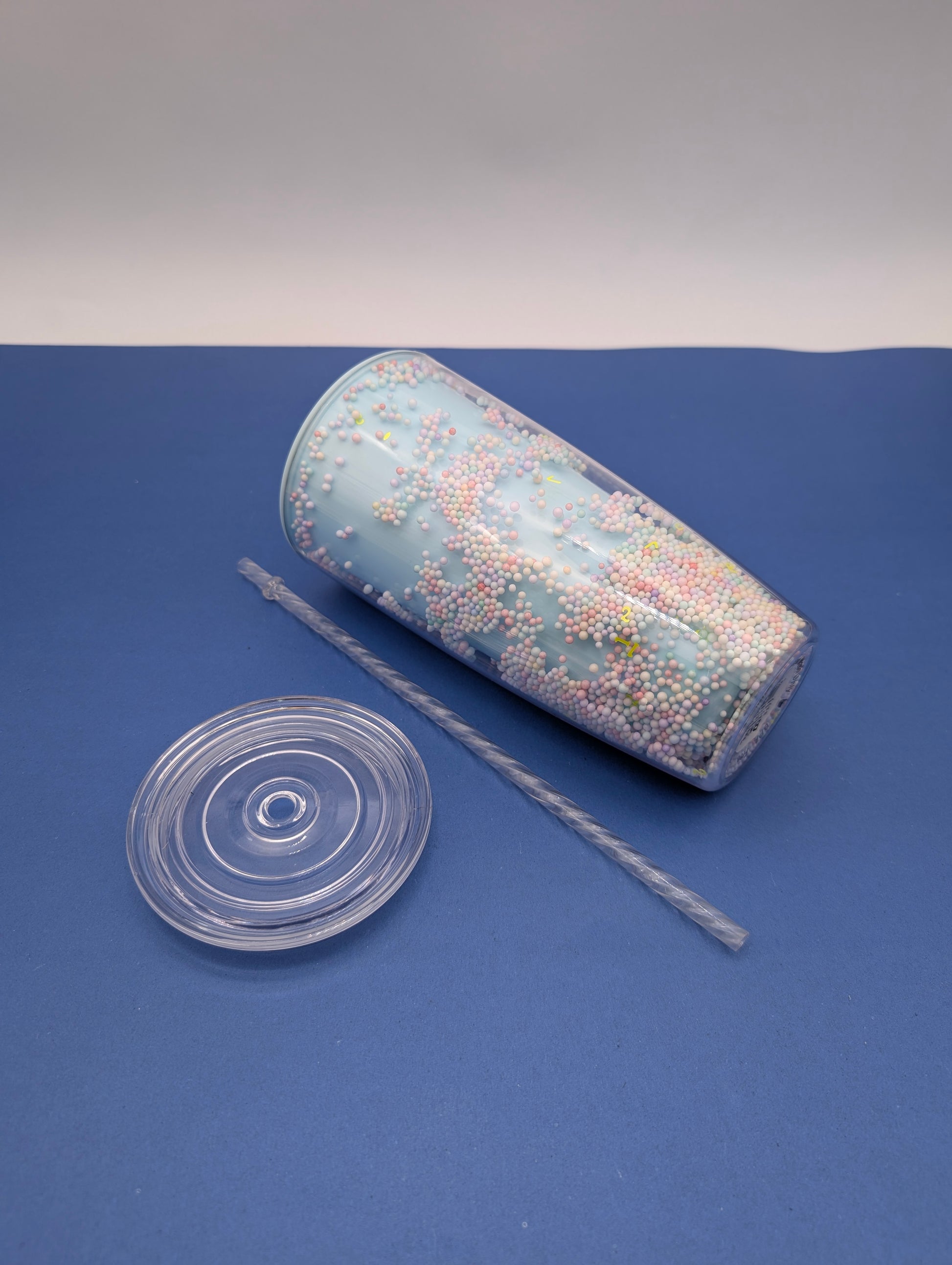 Sip in style with this sky-blue frosted tumbler filled with colorful floating sprinkles. Perfect for adding a splash of fun to your hydration routine!