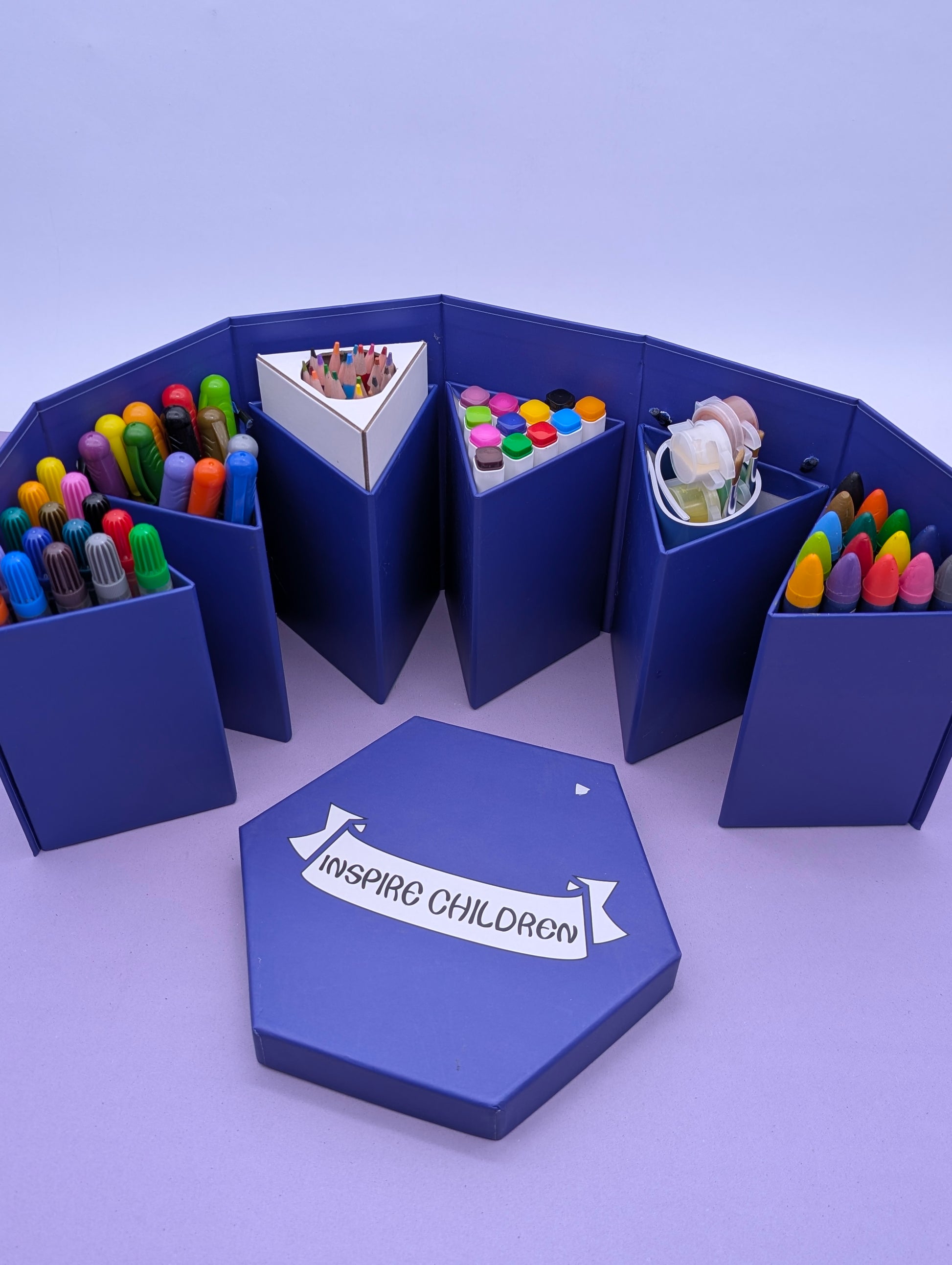 This is an art supply set marketed under the "INSPIRE CHILDREN" brand, containing a variety of coloring and drawing materials.