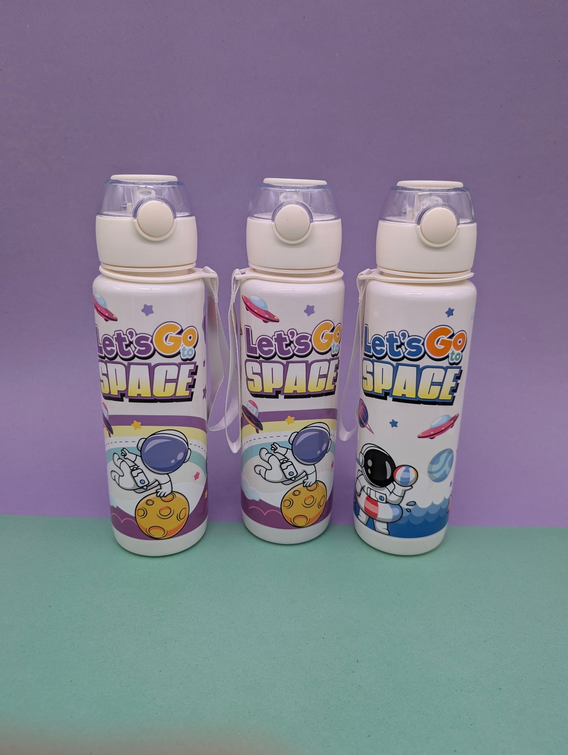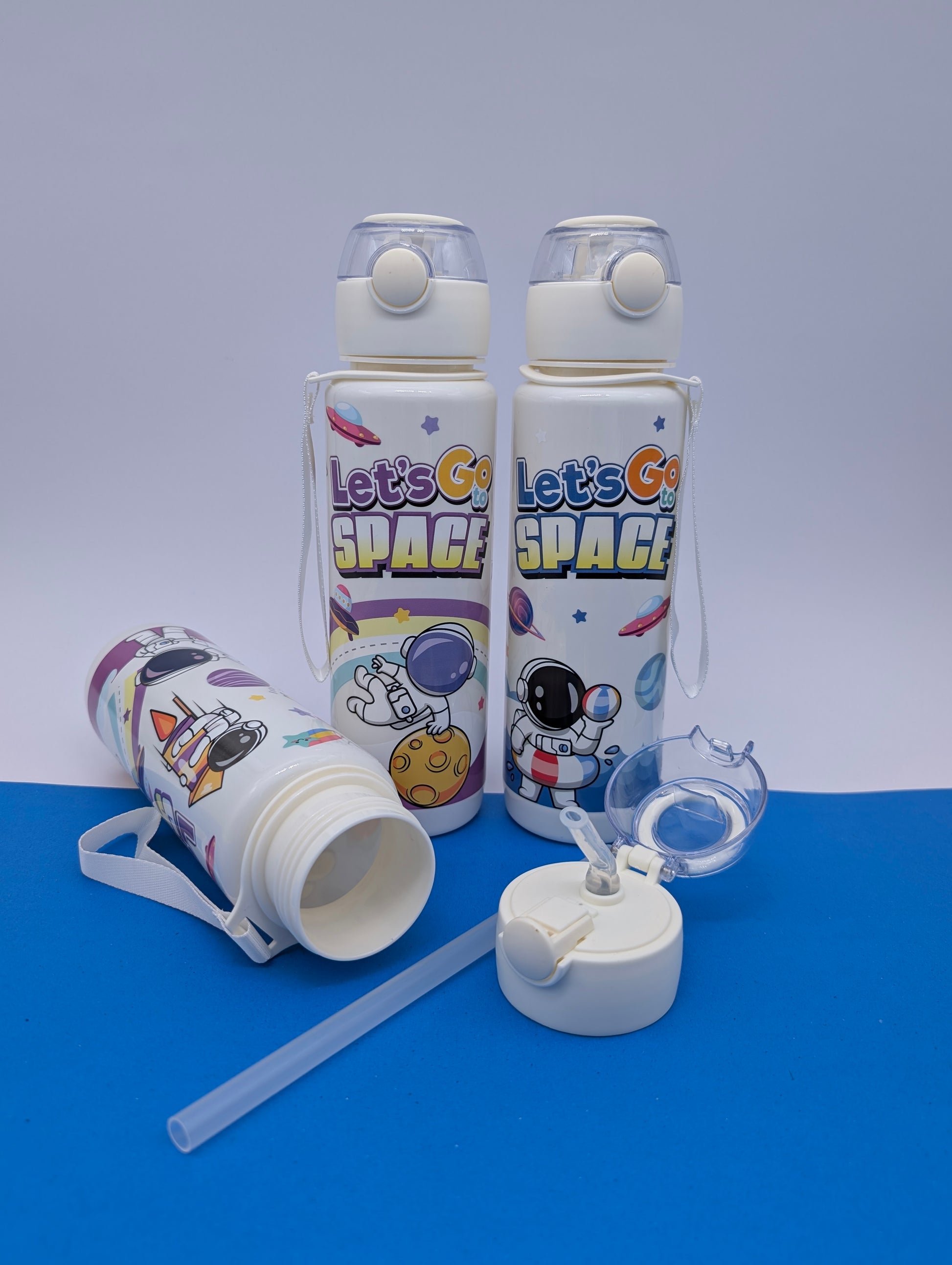 These are children's water bottles with a space theme, featuring astronauts, planets, and the text "Let's Go SPACE". They have a straw and a carrying strap.