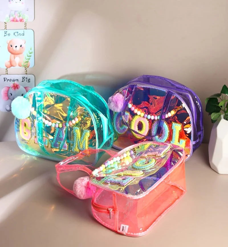 These are small, holographic, transparent backpacks with pompom decorations. They feature a front zipper pocket and are designed for children.