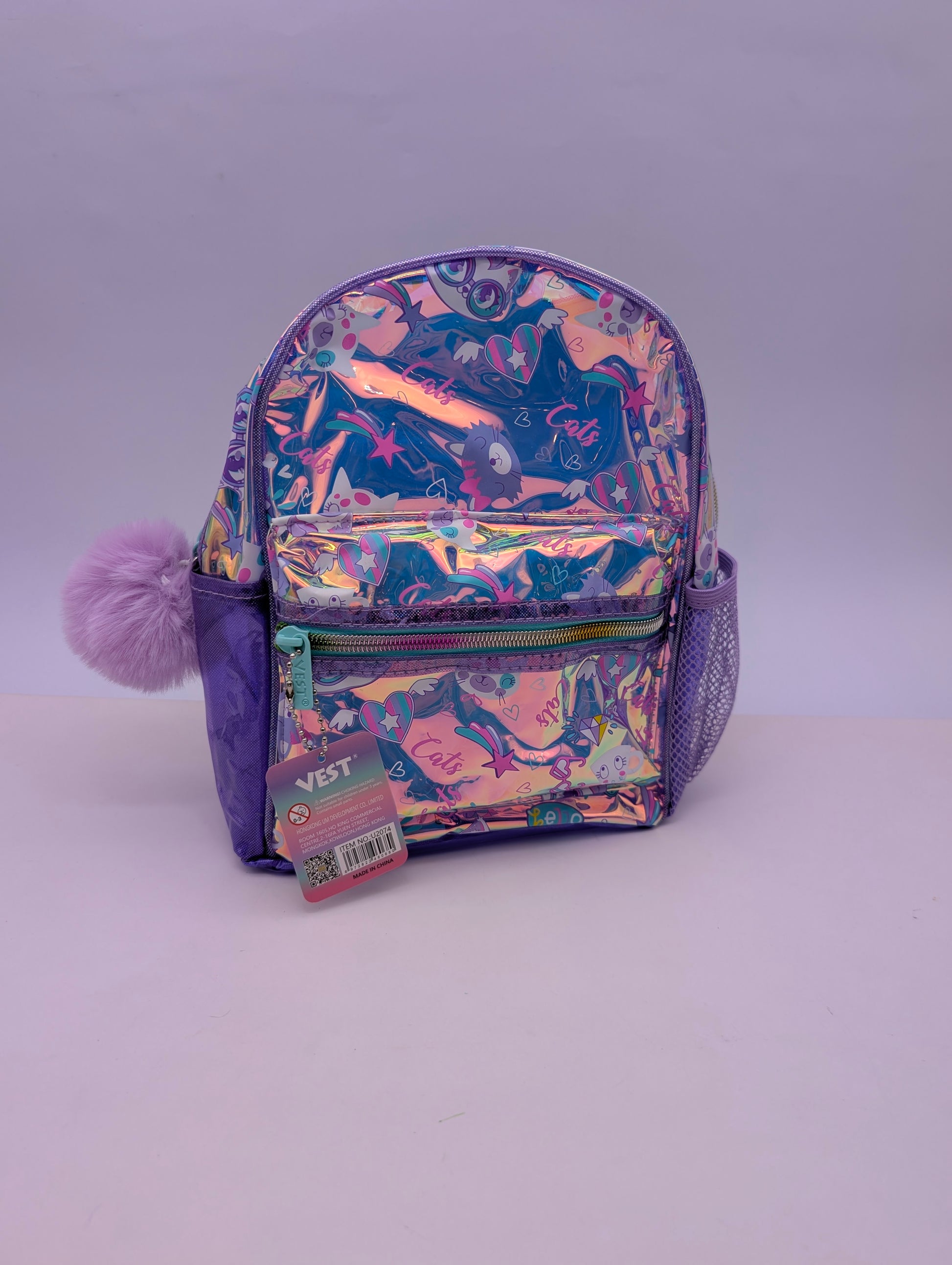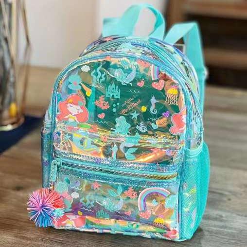 These are small, transparent backpacks with a holographic effect, featuring unicorn and mermaid designs. They have a front pocket and are designed for children.