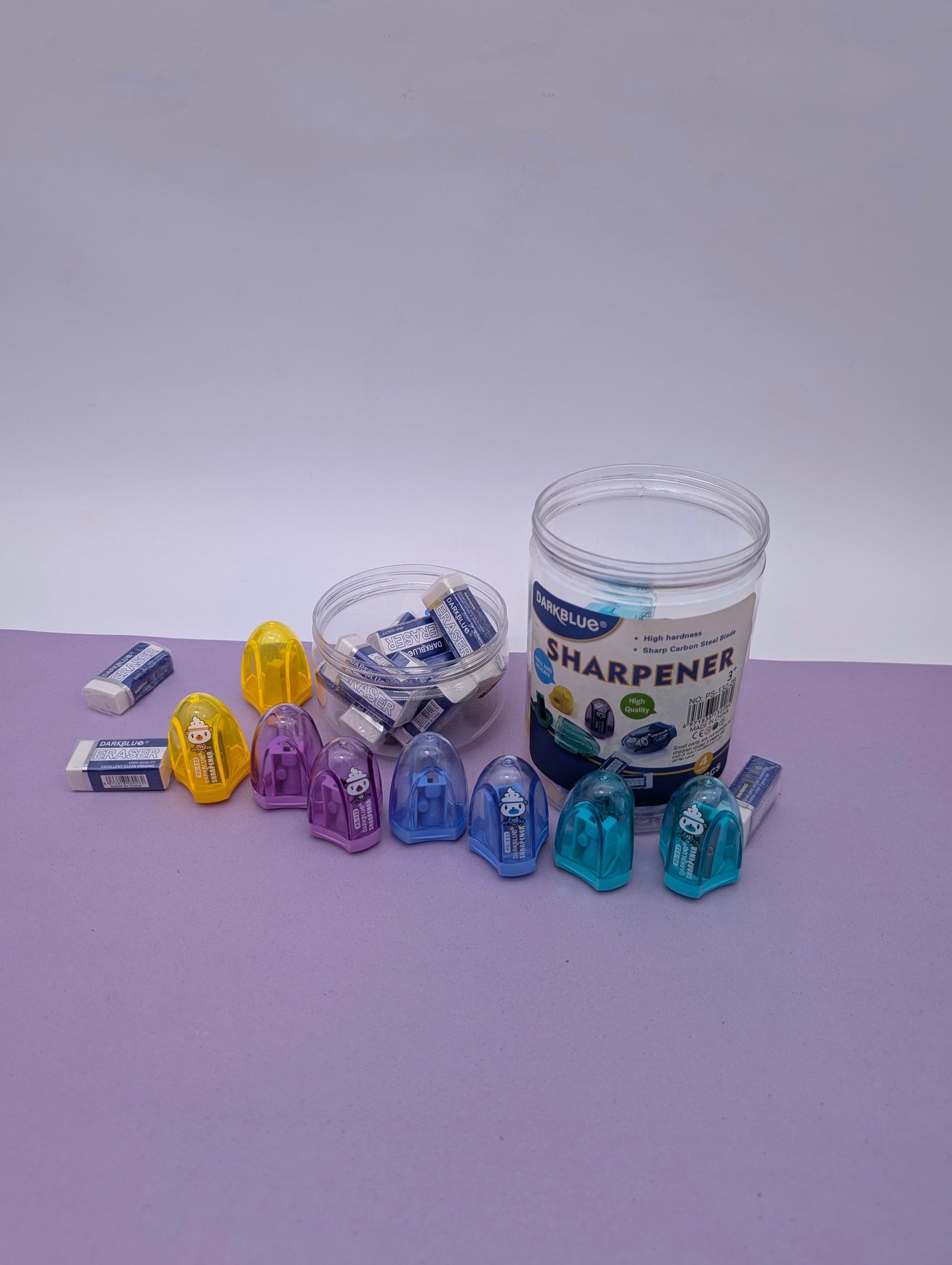 This is a dark blue pencil sharpener, often with a metal blade and sometimes with gold accents. It can be manual or electric, and some models are designed for both standard and larger pencils.