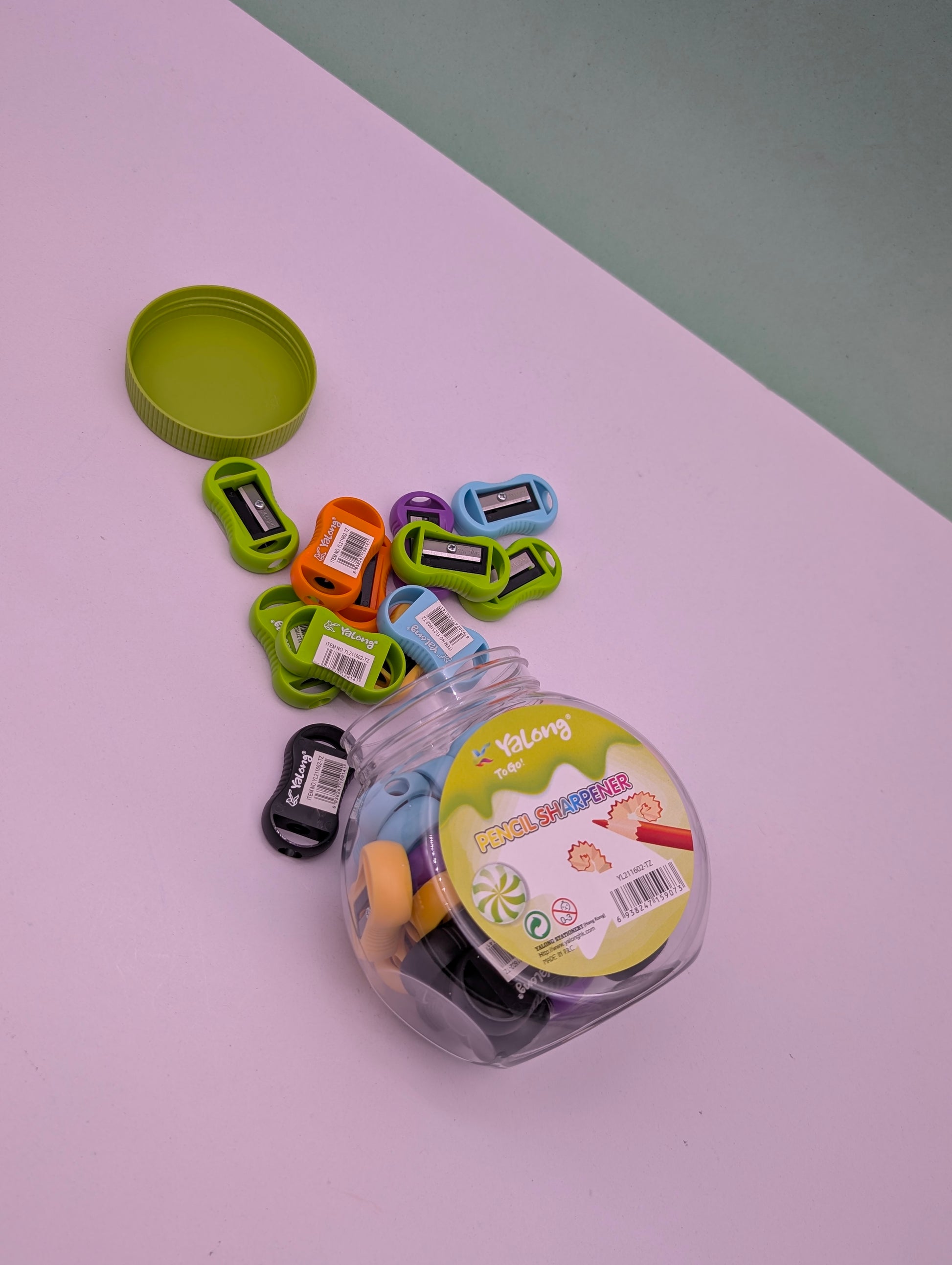 These are small, oval-shaped pencil sharpeners made by Yalong Toys. They come in various bright colors and are designed for basic pencil sharpening.