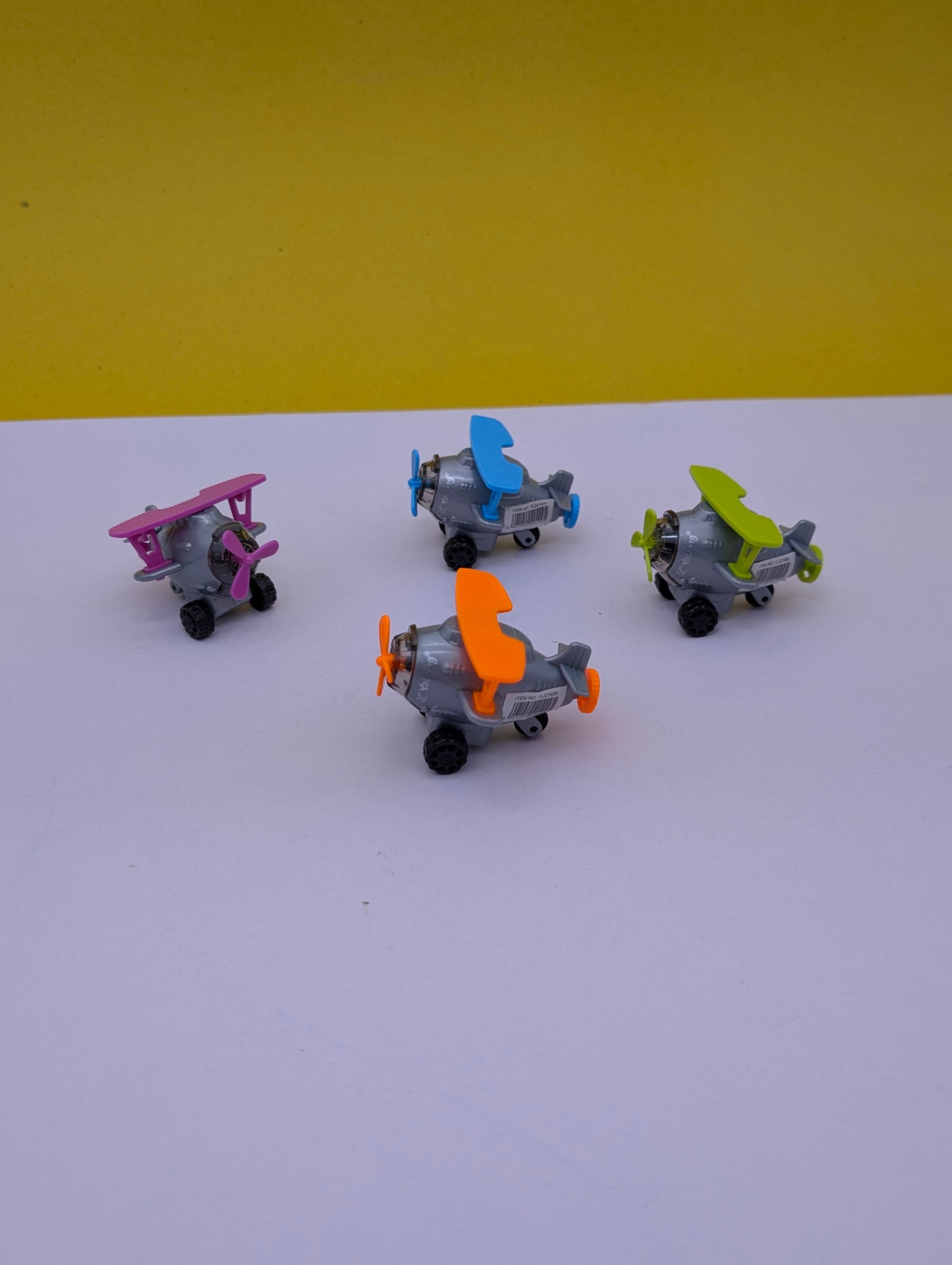 airplane-shaped pencil sharpeners made by Yalong Toys. They come in various bright colors and are marketed as "easy to use and fun."